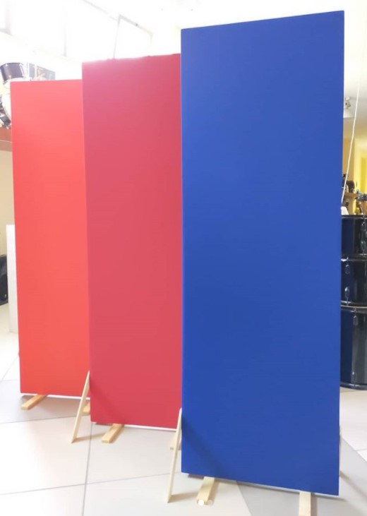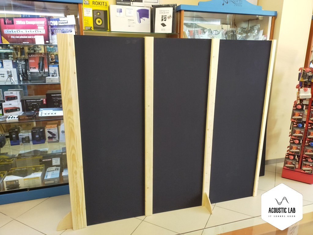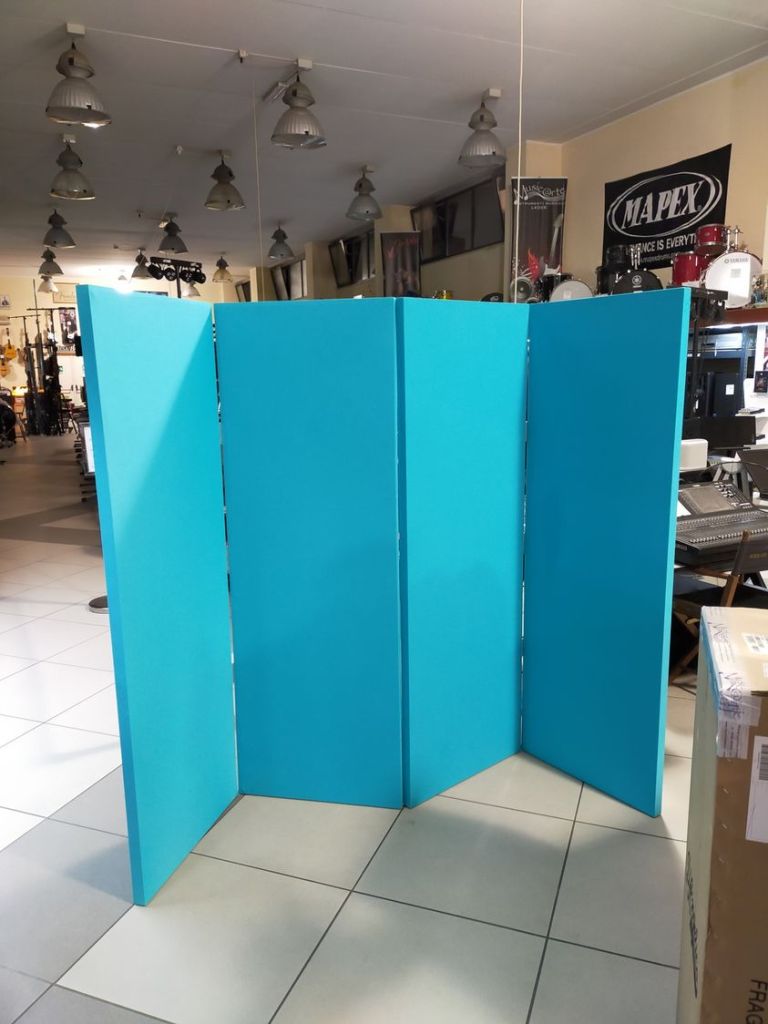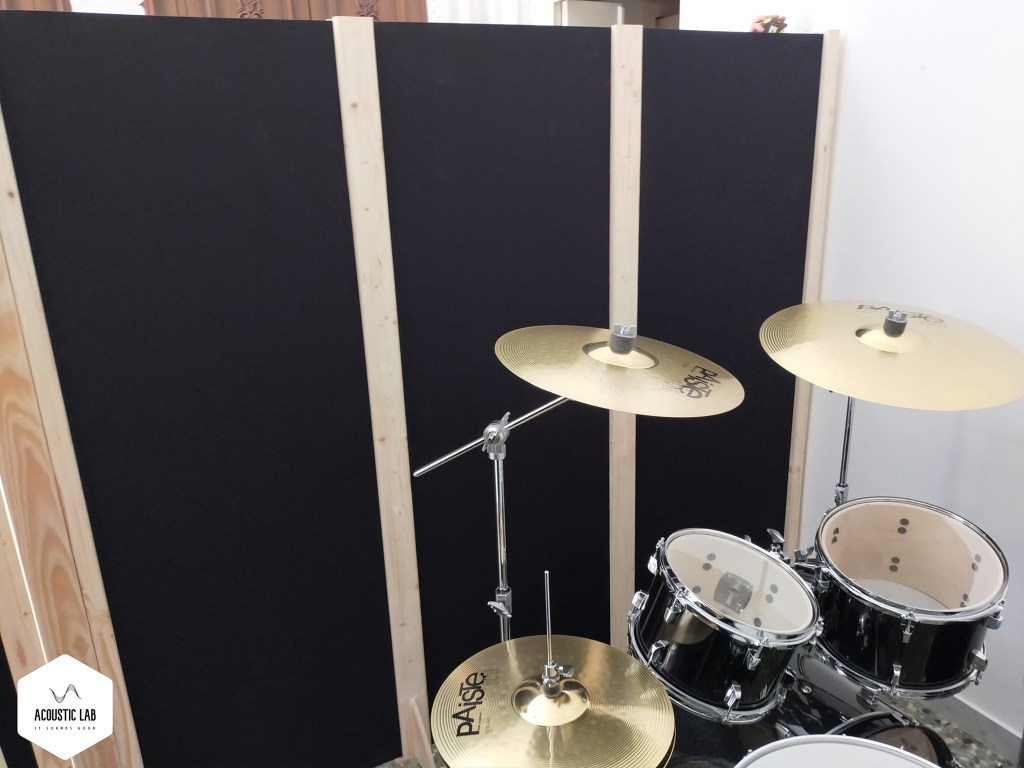 Separè modulare per batteria acustica. Il prodotto é realizzato su misura, con una “porta” per permettere l’ingresso al musicista.