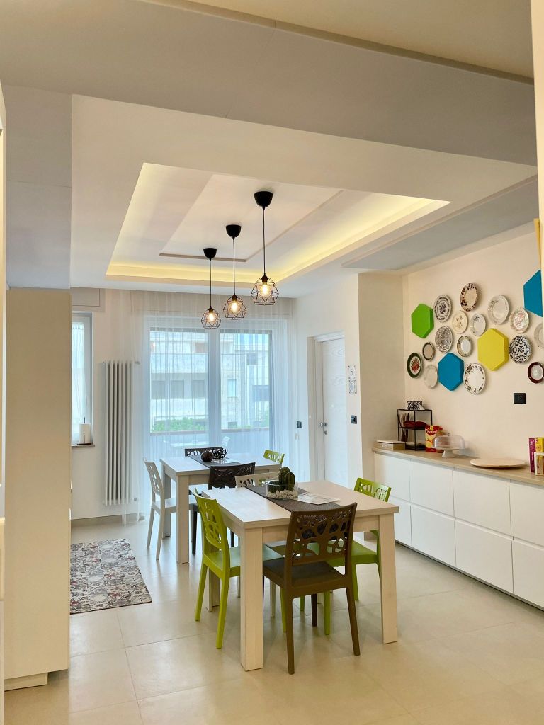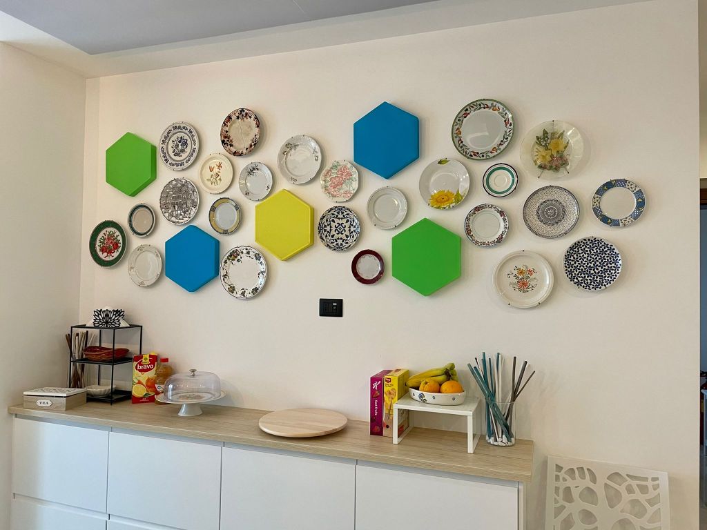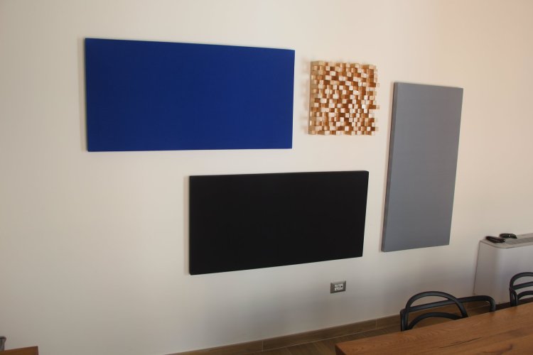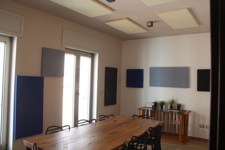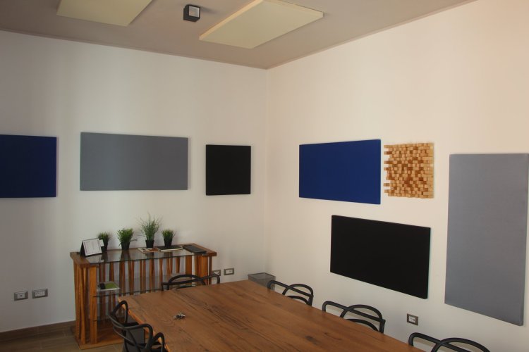 L’alternanza di formati differenti in dimensioni e disposizione a parete rendono il luogo libero da frequenze risonanti. Ottima sala per riunioni o web meeting.
