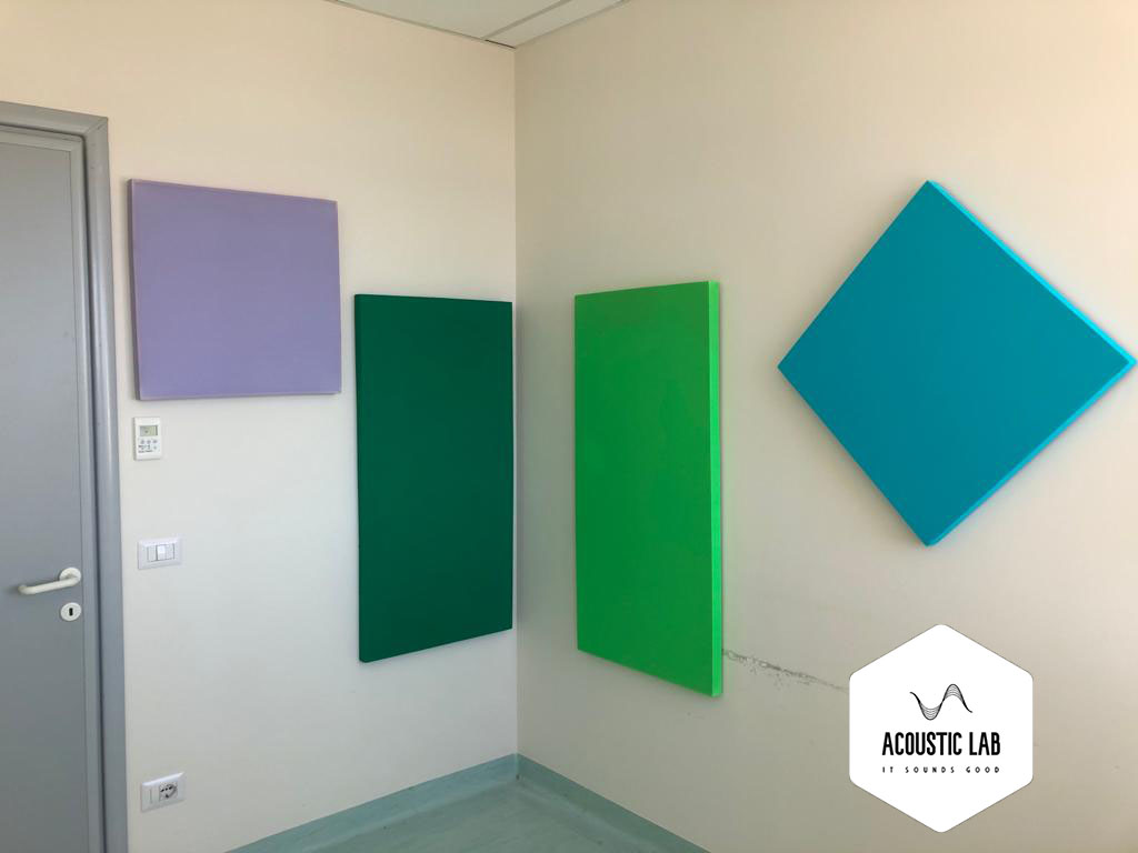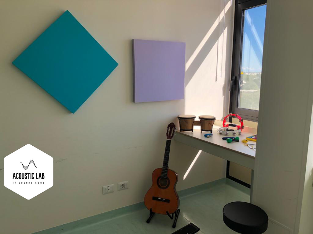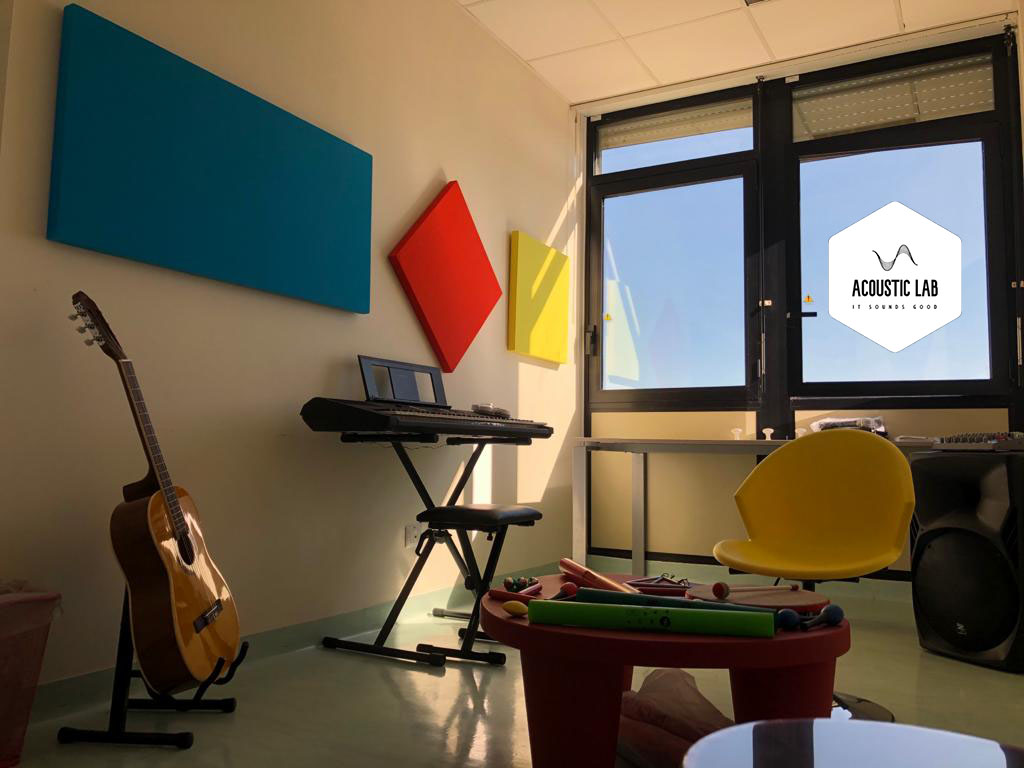 Sala musicale del reparto oncologico pediatrico. Stanze coinvolte nell’istallazione di moduli fonoassorbenti per garantire un feedback acustico ottimale ai giovani praticanti degli strumenti musicali.